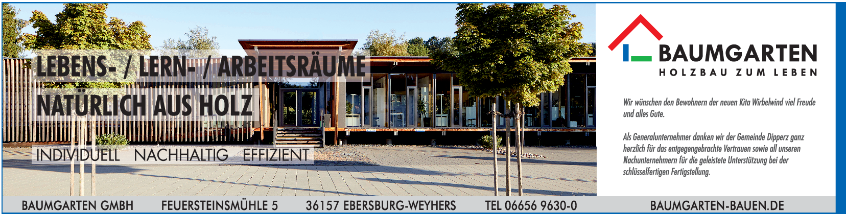 „Diesen Rekord schafft man nur, indem man so eng zusammenarbeitet wie bei diesem Pilotprojekt“, war sich Neumann mit Bürgermeister Klaus-Dieter Vogler (parteilos), aber auch mit Volker Baumgarten, dessen Ebersburger Firma Baumgarten Generalauftragnehmer war, einig. Neumann bedankte sich für das Vertrauen und hob in diesem Zusammenhang das Teamwork und Engagement seiner Mitarbeiterin Carolin Diel und von Alexander Seng, dem Leiter des Bauamtes in Dipperz, hervor. Gebaut wurde ökologisch-nachhaltig – dank der Holzbauweise, einer Fotovoltaikanlage und der Wärmerückgewinnung. Die einzelnen Teile des Gebäudes waren im Weyhers Werk der Firma Baumgarten vorgefertigt worden. Die neue Kita „Wirbelwind“ ist bunt, schick und kindgerecht – sie verfügt neben einer hochmodernen Inneneinrichtung mit großzügigen Gruppen- und Schlafräumen, einem großen Turnraum, einer modernen Küche, einem zeitgemäßen Sanitärtrakt und Räumlichkeiten für die Leitung und das Personal über eine hochattraktive Außenanlage. Sämtliche Handwerksgewerke legten hohes fachliches Können und Liebe zum Detail an den Tag.