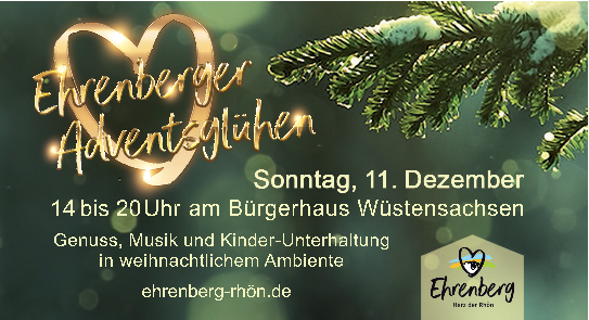 Zum „Ehrenberger Adventsglühen“ laden die Ortsvorsteher und die Gemeinde Ehrenberg (Rhön) am Sonntag (11. Dezember ) von 14 bis 20 Uhr ein. Dabei steht in diesem Jahr „Kulinarik in weihnachtlichem Ambiente“ in der Wüstensachsener Dorfmitte im Vordergrund – ohne die klassischen Weihnachtsmarkt-Verkaufsstände. Mit winterlichen Cocktail-Variationen, leckerem Glühwein, selbstgemachten Burgern, heißem Leberkäse und gegrillten Leckereien, Kaffee & Kuchen, Crêpes, heißen Waffeln, Empanadas, Allerlei von den Streuobstwiesen sowie einer Weinbar im Rathauskeller lässt es sich gut auf die Vorweihnachtszeit einstimmen. Für Kindergartenkinder werden um 15 Uhr und für Grundschulkinder um 16 Uhr Vorlesestunden mit Geschichten zur Weihnachtszeit vom Büchereiteam Wüstensachsen angeboten. Darüber hinaus können die Kids in der Zeit von 14 bis 17 Uhr im Bürgerhaus unter anderem aus Schafwolle mit einer Handspindel Fäden spinnen und zusammen basteln.